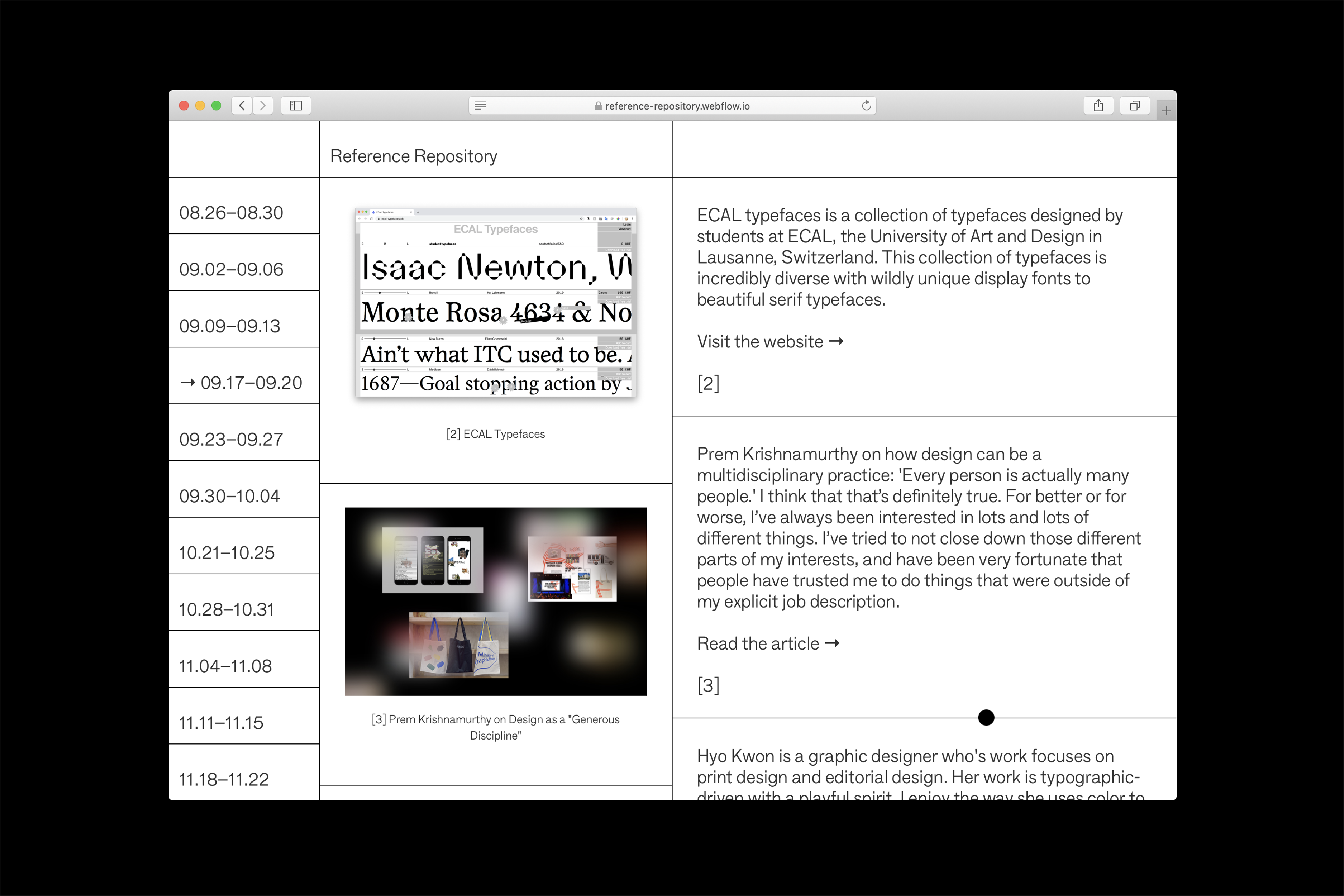 A visual repository of references I collected over the course of one semester—including articles, designers, interesting projects, studios, books I’d read, and various areas of interest I wanted to bookmark. By taking time to find references each week, I encouraged myself to maintain a consistent practice of research and exploration during my studies. Visit the live site (→)